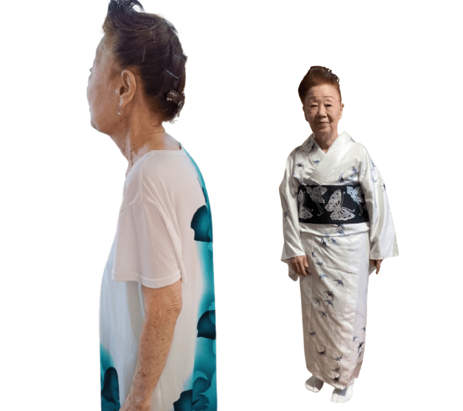 圧迫骨折の影響で、内臓が下垂して、おへそが見えなくなった事、着物の帯が落ちてくるので今までのように着物が着れなくなり、自信喪失していました。